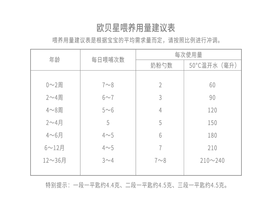平勺奶粉 依照喂哺用量建議表,加入正確份量(平勺)的奶粉,請勿刻意壓平量勺。